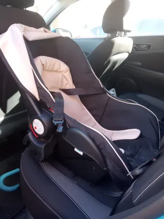 Silla de coche para bebé, ideal para transportar a los más pequeños de forma segura. - Tapicería en tono beige y gris. - Arnés de seguridad de 5 puntos. - Reposacabezas ajustable.
