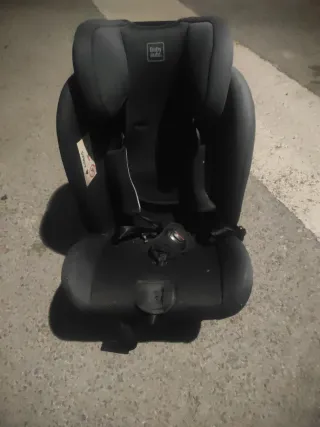 Silla de coche de la marca Babyauto en color negro. - Sistema de arnés de seguridad. - Funda acolchada. - Etiqueta de airbag visible.