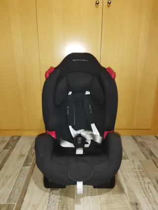 Silla de coche en color negro, con detalles en rojo y gris. - Diseño acolchado para mayor comodidad. - Sistema de arnés de 5 puntos. - Reposacabezas ajustable.