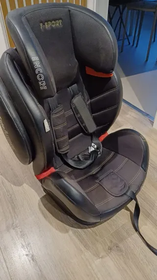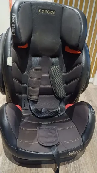 Silla de coche para bebé de la marca Encore, modelo F-Sport, apta para los grupos 1, 2 y 3. Diseñada para ofrecer seguridad y comodidad. - Tapicería negra. - Acolchado en los laterales y reposacabezas. - Sistema de arnés de 5 puntos. - Funda extraíble para lavado.