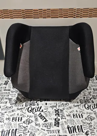 Alzador para coche en color negro y gris. Diseñado para ofrecer comodidad y seguridad. - Acolchado en los laterales. - Tejido transpirable. Para niños de 15 a 36 kg. Esta en muy buen estado, se ha usado muy poco. 40 cm ancho x 16 cm alto