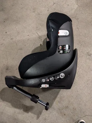 silla de la marca GB Platinum giro de 360° para ir en las dos posiciones, fijación con ISO Fix al coche y tercera palanca al suelo con dispositivo de seguridad por color para confirmar sujecióncorrecta