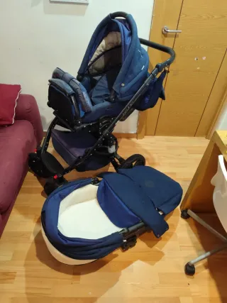 Cochecito de bebé de 3 piezas color azul. - Cochecito con capazo. - Silla de coche. - Diseño moderno. *Fallo en una de las ruedas delanteras a veces se atasca pero funciona perfectamente*