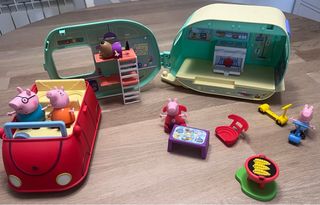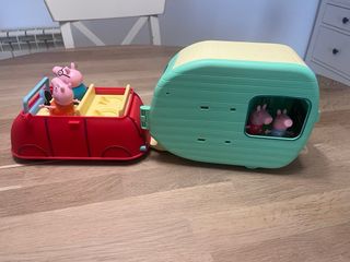 Set de juego de Peppa Pig que incluye un coche rojo y una caravana. - Coche rojo con sonido claxon y figuras de papá Pig y mamá Pig. - Caravana con accesorios y figuras. - Incluye figuras adicionales y accesorios como una barbacoa, mesa y sillas. - En perfecto estado se puede decir como nuevo muy poco uso.