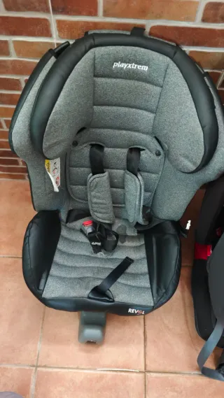 Silla de coche Playxtrem para bebé, diseño universal. Compatible con todos los vehículos. Sistema Isofix. Grupo 1 y 2. De 9 a 25 kilos. Con cinturón y anclajes que permiten acercar y alejar su inclinación para dormir. Muy buen estado general. Tiene un pequeño roto en la tela, se puede coser o poner una pegatina para taparlo. (Foto n° 7) - Tapicería gris y azul. - Reposacabezas ajustable y extraible por completo. - Sistema de arnés de 5 puntos. - Funda extraíble (recién lavada)