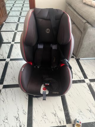 Silla de coche con sistema Isofix. - Color gris oscuro con detalles en rojo. - Incluye arnés de seguridad de 5 puntos. - Reposacabezas ajustable.