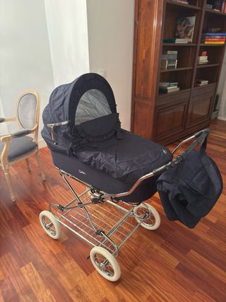 Carro de bebé en color azul marino. Un diseño clásico y elegante para los paseos. - Capazo espacioso. - Ruedas grandes para todo tipo de terreno. - Estructura metálica. - Asa ajustable. con accesorios marca Arrue precio nuevo de 500€