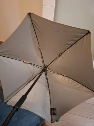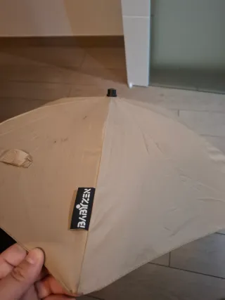 Sombrilla de color beige para bebé de la marca Babyzen. - Etiqueta de la marca visible.