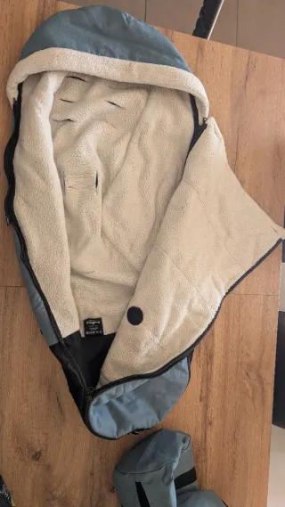 Saco de invierno para el cochecito Babyzen Yoyo. Mantiene al bebé abrigado y cómodo. - Color azul. - Forro interior de borreguito. - Cremallera frontal. - Capucha ajustable. está rozado donde ponen los pies, ver foto