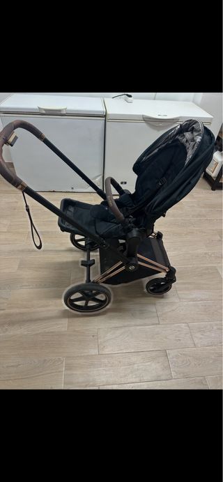 Carro Cybex Priam en color negro con detalles en marrón. - Capazo con funda protectora transparente. - Chasis con manillar y barra de seguridad en polipiel. - Ruedas todoterreno. -Silla de paseo +reductor silla Completamente nuevo comprado en julio de 24.