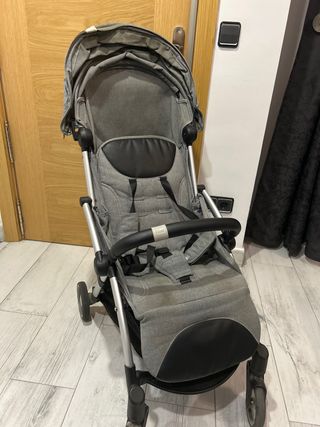 Silla de paseo ligera y compacta, ideal para el día a día. - Color gris y negro. - Capota extensible. - Barra delantera. - Arnés de seguridad. - Bolsa para el aseo. - Plastico lluvia. - Sombrilla. - Manoplas.