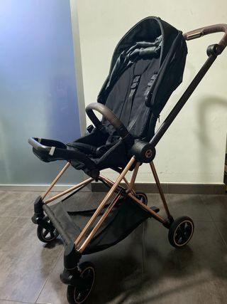Elegante cochecito Cybex Mios en color negro con detalles en rosa oro. - Diseño moderno y funcional. - Capazo espacioso. - Chasis ligero y resistente. -Capazo como nuevo apenas uso -El chasis esta mas usado tiene algún arañazo y el manillar esta pelado . - Tambien tengo la silla de paseo que la regalo, pero tiene una pequeña rotura y esta con bastante uso