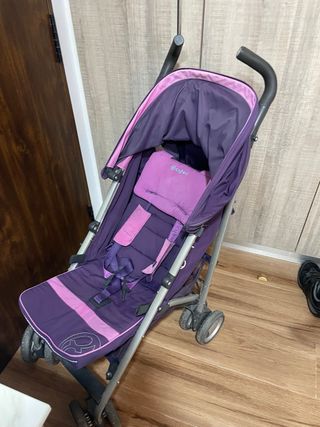Carro de paseo Cybex Gold en color lila. - Capota extensible. - Chasis ligero y maniobrable. - Ruedas todoterreno. Útil y bonito y en buenas condiciones. Le falta la parte donde se agarran los niños que no es imprescindible. Por lo demás todo perfecto.
