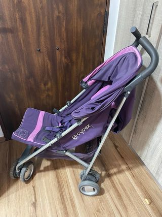 Silla de paseo de la marca Cybex en color morado. Es ligera y fácil de plegar. - Capota con ventana. - Arnés de seguridad de 5 puntos. - Barra delantera. - Ruedas delanteras giratorias.