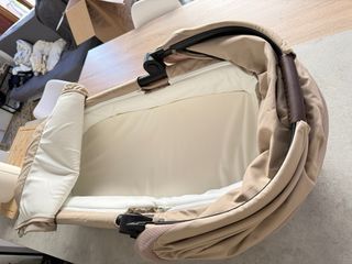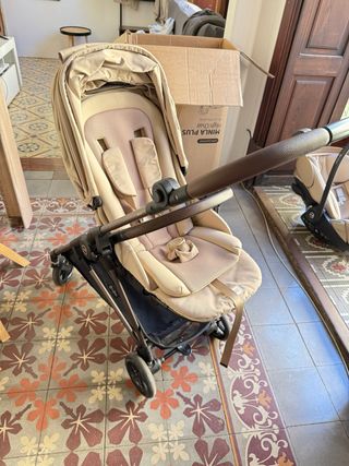 Silla de paseo Cybex Melio Gold en color almond beige. - Diseño elegante y funcional. - Capota extensible. - Empuñadura y barra protectora en polipiel (en muy buen estado) - Chasis ligero y maniobrable. El capazo está como nuevo (se usó poco). La silla sí que tiene muestras de uso en la tapicería (tiene algunas zonas decoloradas y la zona de los pies está rozada de limpiarla, como se muestra en las fotos). El chasis tiene algunos rayones, como se ve en las fotos, pero en el uso normal apenas se ven.