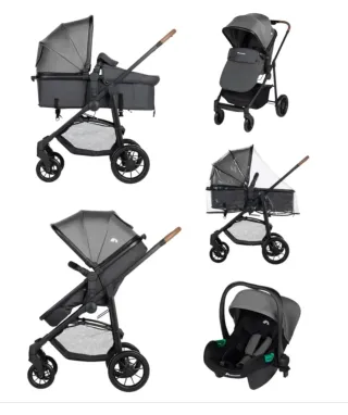 Carro de bebé versátil que sirve como cuco, silla de coche y silla de paseo. - Capazo amplio y cómodo. - Silla de paseo reversible. - Chasis ligero y plegable. - Incluye adaptadores para silla de coche.