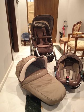 Conjunto de cochecito para bebé de tres piezas en color marrón. - Silla de paseo. - Capazo. - Silla de coche. protector para el viento y la lluvia y un bolsito. Está muy bien cuidado.