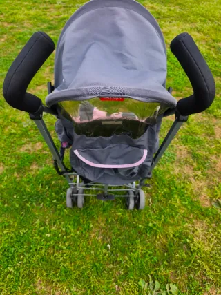 Carro de paseo Maclaren en color rosa y gris. Es ligero y fácil de plegar. - Capota amplia. - Arnés de seguridad. - Reposapiés. - Ruedas delanteras giratorias.