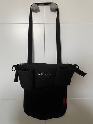 Bolso para carritos, cochecitos o silla se paseo MACLAREN. Aunque vale para cualquier sillita.Tiene varios compartimentos. Dos para biberones y/o botellas de agua. Un bolsillo multiusos o toallitas y el grande de red. No tiene apenas uso, sin marcas de sol. Envío ya lavado y desinfectado.
