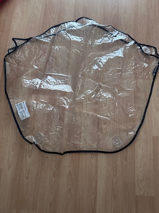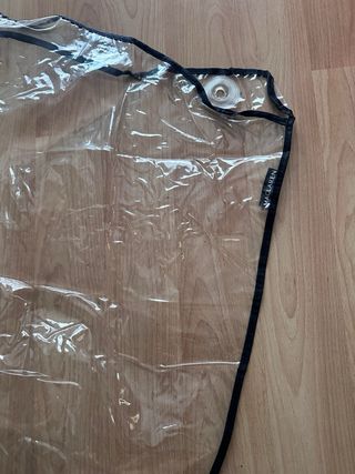 Protector de lluvia transparente para cochecito Maclaren. Mantiene al bebé seco en días de lluvia. - Material de plástico transparente. - Borde negro. - Cierres de botón a presión.