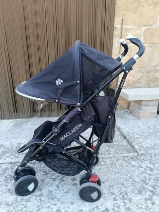 Vendo práctica silla de paseo Maclaren, ideal para viajes. Se encuentra en buen estado, con algunas señales normales de uso. - Plegado compacto y ligero. - Capota extensible para proteger del sol. - Cesta portaobjetos.