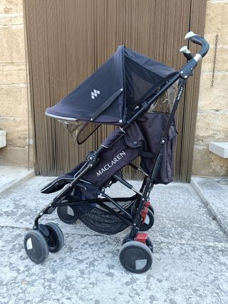 Silleta de bebé Maclaren en color negro Se encuentra en buen estado. Dispone de capota extensible y arnés de seguridad de 5 puntos. Ideal para viajes debido a que se plega y queda muy compacta para su transporte, entra en cualquier maletero. Se incluyen dos sacos de invierno de dos tamaños distintos.