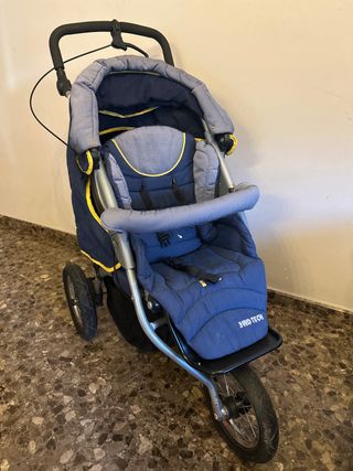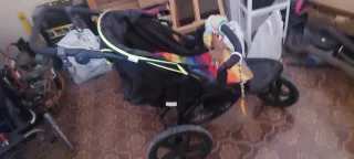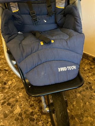 Para salir a correr con el niño/bebé Ruedas en buen estado, se quitan. Mesita con hueco para biberón. Se puede fijar la rueda delantera para que no gire y correr mejor. Apoyo de pies suelto, hay que fijarlo con bridas o algo.