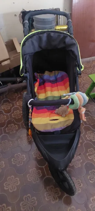 Se recoge en Tres Cantos. Comprado en Amazon hace un año. Es apto desde el Nacimiento hasta 25 kg. Se puede usar como carro de paseo o para correr. Se pliega rápidamente con tan solo una mano. El respaldo y el reposapiés de la silla se pueden ajustar para ofrecer la máxima comodidad, acostado o sentado. Ruedas grandes y giratorias para ser manejable sobre todo tipo de terreno. El manillar es también regulable.