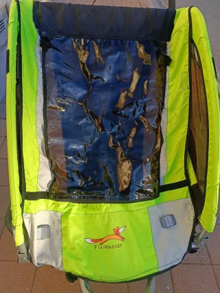 Carro biplaza para niños, ideal para usar con bicicleta o para correr. - Diseño en color verde lima y gris. - Ventana transparente en la parte superior. - Logo de Fiximaster en la parte frontal.