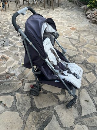 Silla de paseo con plegado tipo paraguas. Respaldo reclinable con una sola mano hasta reclinado total. Reposapiés regulable. Arnés de seguridad de 5 puntos. Capota abatible. Cesta inferior portaobjetos. Ruedas delanteras dobles giratorias con bloqueo opcional. Ruedas delanteras con freno. Desenfundable y lavable. Perfecto estado. Vendo por falta de uso.