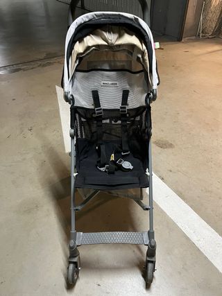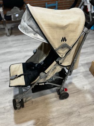 Silla de paseo Maclaren negro y beige. Es ligera (6kg aprox) y fácil de plegar. Genial para gente alta, y cómoda la peques. Capota, arnés de seguridad y ruedas delanteras giratorias. Limpia, muy bien conservada, regalo bolsa para la funda de lluvia con el precio. La funda de lluvia está limpia y en perfecto estado, toda su vida útil por delante. Se reclina casi horizontalmente y por las piernas se baja hacia el sopote de goma. Todo funciona como nuevo, a toda prueba. Tiene el asa lateral para mano, la cinta trasera para hombro, y la cinta para evitar que se escape para la muñeca en perfecto estado. +In Amazon/web. ¡Oportunidad!