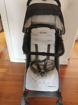 Silla de paseo tipo bastón de la marca Maclaren. Es ligera y fácil de plegar. - Diseño compacto. - Ruedas delanteras giratorias. - Asiento reclinable.