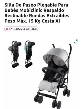 Silla de paseo plegable Mobiclinic para bebés. - Respaldo reclinable. - Ruedas extraíbles. - Peso máximo: 15 Kg. - Cesta XL. - Exclusivo online.