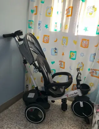 Triciclo infantil con diseño moderno y funcional. - Asiento acolchado y reclinable. - Barra de empuje para padres. - Reposapiés. - Cesta de almacenamiento.