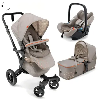 Sistema modular en el que se puede intercambiar capazo, silla de paseo, o grupo 0 Chasis de aluminio con cierre tipo paraguas. Silla con respaldo y reposapiés reclinables en 4 posiciones hasta llegar a la horizontal. Silla que se puede poner en el sentido de la marcha y en sentido inverso. Ruedas delanteras giratorias y con bloqueo de dirección. Freno trasero centralizado para las 2 ruedas. Capota regulable y cesta portaobjetos. Fundas desenfundables y lavables a máquina.