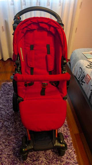 Consta de 3 piezas, capazo, silla de coche y silla de paseo. Chasis tubular de aluminio. Suspension independiente en las ruedas traseras, son extraibles y mas grandes y resistentes. Tienen amortiguador. Silla reversible y respaldo graduable 3 posiciones. El capazo se puede plegar haciendolo mas fino. Freno en la empuñadura. Incluye protector de lluvia, bolsa portaobjetos y ganchos para bolsas. Tambien se entregan todas las instrucciones.