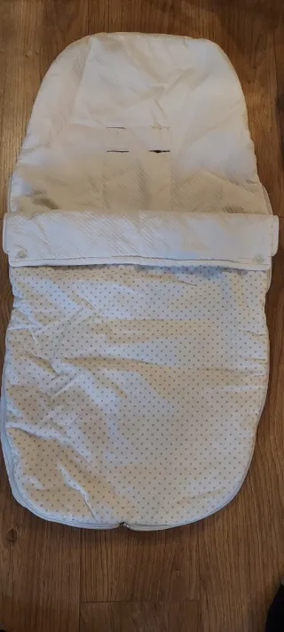 Saco para silla de paseo en color blanco con un suave estampado de topitos grises. Es acolchado y cuenta con aperturas para el arnés de seguridad. - Diseño reversible. - Tejido exterior de algodón. - Interior suave y cálido.