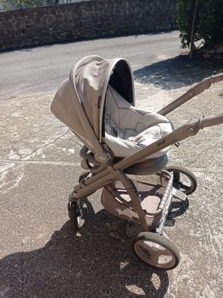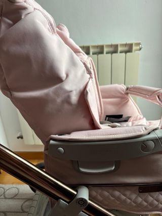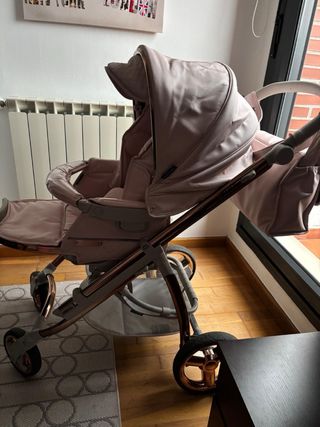 Carrito de bebé en color rosa, con detalles en tono cobre. - Estructura metálica. - Capota ajustable. - Incluye bolso. -Descripción Pack Duo carro de bebé, modelo Ip-Op XL en polipiel. Incluye silla de paseo, capazo, bolso y sombrilla. - Color rosa palo con chasis en fumé rosa. - Capota extensible. - Asiento acolchado y reversible. - Cesta de almacenamiento inferior. Usado por un sólo bebe, esta muy bien cuidado aunque con los deterioros normales del uso diario. Es de piel sintética.