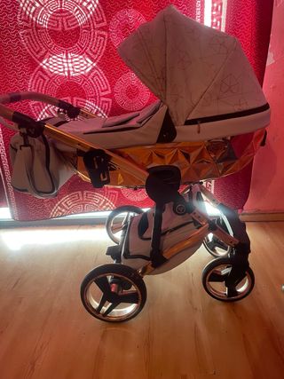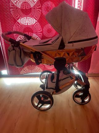 Elegante cochecito de bebé con un llamativo acabado dorado y detalles en blanco y gris. Perfecto para paseos con estilo. - Estructura principal en acabado dorado brillante. - Capota con estampado geométrico. - Ruedas con diseño deportivo. Y tiene las tres piezas incluye plástico de lluvia y bolso precio negociable