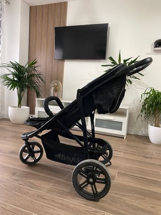 Carro de niño de tres ruedas, ideal para correr o paseos. - Color negro con detalles en verde lima. - Ruedas grandes ideal para todo tipo de terreno. - Asiento acolchado y reclinable. - Arnés de seguridad. - Cesta de almacenamiento inferior. - Marca Hauck. El único desperfecto es el que se ve en las fotos en el mango, del uso.