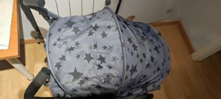 cochecito ligero y manejable, perfecto para el coche y facil de plegar. usado pero funciona del todo bien. tiene las botones de los lados rotos, pero no hacen falta ya que tiene un gancho adicional (se ve en la foto) no afecta. con fundas tuc-tuc y bilsita de guardar cosas. recien limpiado