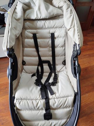 Silla de paseo en color beige, ideal para transportar a los más pequeños. - Capota ajustable. - Arnés de seguridad de 5 puntos. - Reposapiés. - Ruedas delanteras giratorias.