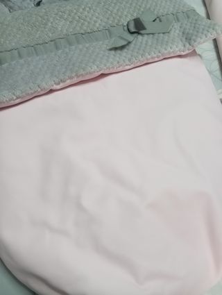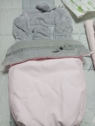 Saco para silla de paseo en tonos gris y rosa. El exterior es de un suave tejido gris con textura y un detalle de lazo, mientras que el interior es de un delicado color rosa. - Tejido exterior gris con relieve. - Detalle de lazo gris. - Forro interior rosa.
