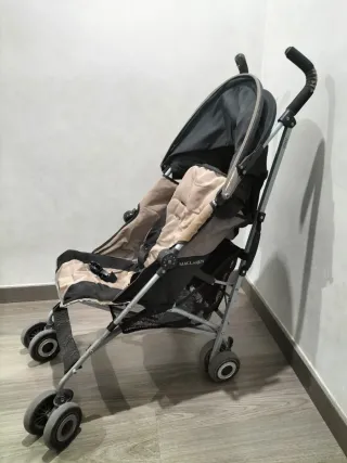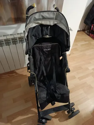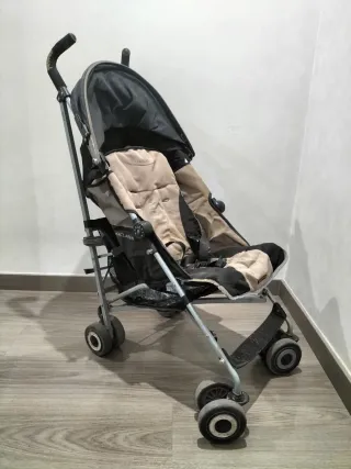 Está bastante usada por eso si precio pero funciona perfectamente ya que es una Silla hecha para durar. Silla de paseo ligera y compacta, ideal para viajes y el día a día. Fácil de plegar y transportar. - Marca: Maclaren - Color: beige y negro - Ruedas delanteras giratorias - Capota - Cesta de almacenamiento