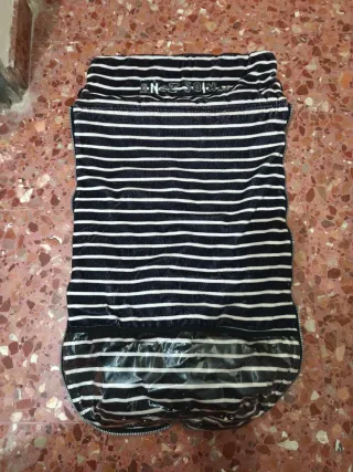 Conjunto de fundas para silla de paseo con un bonito diseño a cuadros y topitos, reversible, y otra de puntillas. - Funda principal a cuadros azul y blanco con ribete reversible. - Funda secundaria a rayas azul claro con detalles de encaje. si se añade al lote del saco y bolso, dejo este de las fundas de verano a 10€