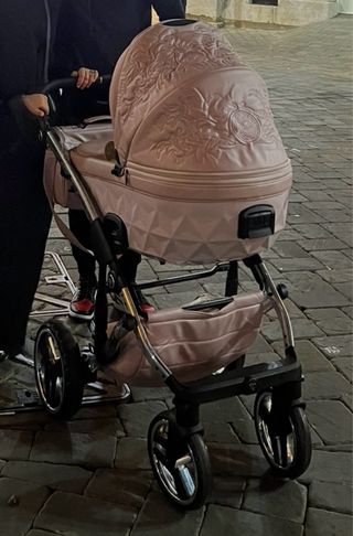 Carro de bebé de la marca Junama en color rosa. Incluye silla de paseo. - Diseño elegante con detalles en relieve. - Estructura resistente y ruedas maniobrables.