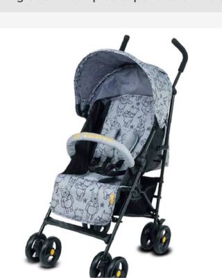 Silla de paseo para bebé con un diseño encantador de Winnie the Pooh. Ha sido utilizada una sola vez. - Capota con estampado. - Barra de seguridad acolchada. - Arnés de sujeción. - Ruedas delanteras giratorias.