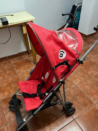 Silla de paseo ligera y compacta, ideal para llevar a los más pequeños. - Color rojo vibrante. - Capota con ventana. - Arnés de seguridad. - Ruedas delanteras giratorias.