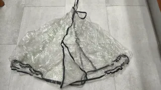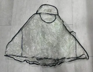 Protector de lluvia transparente para silla de paseo McLaren. Mantiene al bebé seco en días de lluvia. - Material plástico transparente. - Borde con ribete negro. Tiene unas manchas amarillas que se aprecian en la foto