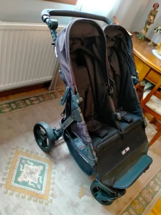 Silla gemelar de la marca Baby Monsters, modelo Easy Twin. Ideal para hermanos con poca diferencia de edad o gemelos. - Diseño en color negro. - Capotas independientes. - Arnés de seguridad de 5 puntos. - Capazos incluidos.